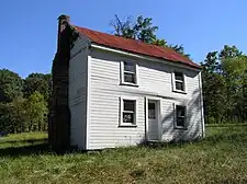The original 1774 portion of the mansion is a square two-story Georgian-style structure with a basement and attic, an architectural style prevalent in Virginia at the time of Wappocomo's construction.[13] This part of the mansion is built of large weighted ballast bricks, with walls that measure 1 foot 6 inches (0.46 m) in depth, allowing for deep inset windows.[13] It also features two inside chimneys on either side, which once stood higher above its steep roof.[59] The mansion's formal entrance is covered by a small portico supported with wooden columns and engaged columns at the wall.[35]
