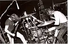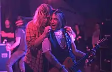 War Babies, featuring the line-up of Brad Sinsel (vocals), Tommy "Gunn" McMullin (guitars), Guy Lacey (guitars), Shawn Trotter (bass), and Richard Stuverud (drums) scored a contract with Columbia Records in 1991. They recorded their debut album, War Babies (1992) at A&M Studios in Hollywood, CA with noted producer, Thom Panunzio and engineer, Bill Kennedy.[2] Their first single and MTV video, "Hang Me Up", was co-written by McMullin and Paul Stanley of Kiss. Two other singles were released, "Blue Tomorrow" (a song dedicated to Andrew Wood, who was a friend of Sinsel and McMullin's), and the power ballad, "Cry Yourself to Sleep", co-written by Sinsel and Stanley.[3] The song "In The Wind" can be heard in the 1992 film Buffy the Vampire Slayer but was not included on the official soundtrack.