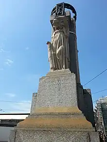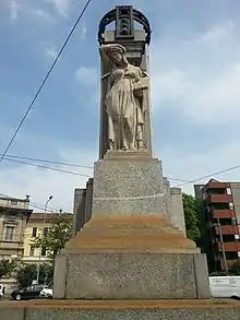 The monument was inaugurated in 1924[1] and was designed by Ugo Prat. The four statues towering the structure have later been attributed to sculptor Emilio Agnati (1876-1937).[2] Two of those stand on a plinth surmounted by an iron crown facing North and South while two statues of women in marble are on the West and East side. On the base two bas-reliefs in bronze complete the work. Two commemorative plates laying at the footstep of the plinth list the names of the soldiers who lost their life in the conflict.