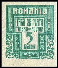 War tax due stamp, Romania, 1918. Inscription: Romanian: "Taxa de plată. Timbru de ajutor" ("Fee of payment. Stamp of help")