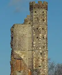 The Cotton family were Royalists which resulted in the manor being largely demolished by Parliamentarian forces.[9] One turret of the gatehouse was left as an aid to navigation for ships in Langstone channel.[8] The turret is octagonal in form and four stories in height.[2] It is largely built from brick with stone dressing and battlements.[13] After The Restoration, the property was returned to the Cotton family who built a farmhouse near the ruin.[1] The latter is now Grade II listed.[14]