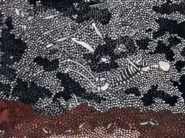 While the painting has been described as showing the story of an ancestral being called Lungkata starting the first bushfire,[13] it portrays elements of nine distinct dreamings, of which Lungkata's tale is the central motif. Lungkata was the Bluetongue Lizard Man, an ancestral figure responsible for creating bushfire. The painting portrays the results of a fire, caused by Lungkata to punish his two sons who did not share with their father the kangaroo they had caught. The sons' skeletons are on the right hand side of the image, shown against a background representing smoke and ashes.[9]