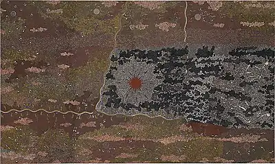 Contemporary Indigenous Australian art originated with the Indigenous men of Papunya, located around 240 kilometres (150 mi) northwest of Alice Springs in Australia's Western Desert, who began painting in 1971.[4] The youngest was Clifford Possum Tjapaltjarri, encouraged by his older brother Tim Leura Tjapaltjarri.[5] A number of the men developed a distinctive style of narrative painting that, beginning around 1976, resulted in the production of several "monumental" works that included representations of both their traditional lands and of ceremonial iconography.[6][7] Clifford Possum was the first to make this transition commencing with a related painting, also titled Warlugulong (1976), now held by the Art Gallery of New South Wales.[8] The two images are amongst five that the artist created between 1976 and 1979 that linked the iconography of sacred stories to geographic representation of his country – the land to which he belonged and about which he had traditional knowledge.[9][10] The artist's images of this period are visually complex, and contain a wide variety of patterns, unified by strong background motifs and structure.[11]