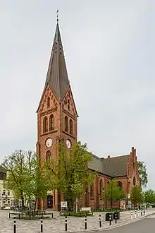 The old church, which burned down twice, stood on the Warnow riverside for around 600 years and was demolished, after completion of the new church, in 1872. The construction of the new church began in 1866 on the western side of the old fisherman's village, and it was ready in 1871 the church. The new building, designed by architect, Krueger of Schwerin, and built by master builder Wachenhusen of Rostock, was erected on the western outskirts of the settlement, but nowadays is the centre of the town. The church therefore is in fact relatively young, but decorated with major furnishings that were inherited from the earlier building. Originally three narrow lancet windows were planned for the transept facades. But the principal, Frederick Francis II, Grand Duke of Mecklenburg, patron of Warnemünde Church insisted that a single large window would be much more appropriate; the architects designed the rose windows, which can still be seen today.