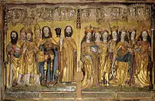 The Gothic carved altar from around 1475 – rumours say it was taken from a shipwreck – is the work of an unknown master from Gdańsk. It was restored in 2010. In the central shrine the figures are next to and behind each other in an odd way, without being connected by a common theme as was usual at that time. A pillar in the middle divides them into two groups. In the front row on the left the Saviour blessing, St. George, St. Nicholas (probably) and John the Baptist can be seen. Behind it Saint Maurice as a Moor, St. Gregory as pope and a bishop (perhaps the St. Erasmus). In the front row on the right there are Mary, the mother of Jesus, Mary Magdalene with ointment jar (or is it the St. Barbara with her tower ?), St. Catherine with the wheel and sword and St. Dorothea with roses and the cup. Behind them are seen three crowned female saints, of which only the St. Agnes with the lamb can be determined. In the right wing one can see five Acts: of which Paul and James the Elder are pilgrims, Judas Thaddeus with club and two female saints, including St. Elizabeth recognizable on the pitcher and the plate. Below is a deacon, probably the St. Lawrence. In the left wing are the other seven apostles and St. Stephen with three stones in the arm. Of the apostles only the four top can be determined: Peter, Andrew, John and Bartholomew. On the predella above the table are in the middle: Christ crowned with thorns, right the St. Elizabeth and Mary Magdalene, left St. Agnes and St. Barbara with a chalice. The crucifix in front of the altarpiece is the oldest art work in the church. It was created in the first third of the 15th century and was already in the same spot in the old fishermen's church.