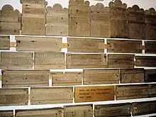 The objects preserved from the old church of Warnemünde include the house marks of the locals, carved once into the pews. About 60 pieces of wood, collected by a working group and then combined into a display on the wall at the right of the entrance. The house marks are to visit for free in today's church.