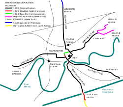 The town of Warrington was already well served by railways, canals and turnpike roads when in 1880,[2] a private company approached Warrington Corporation about the possibility of laying a horse tramway within the town. After an investigation into existing horse tramways in operation in Bristol and Hull, the corporation declined the offer, not wanting outsiders making a profit from the residents. It was not until the construction of a power generating station at Howley in 1900 that the corporation was encouraged to apply to Parliament for powers to lay down and operate an electric tramway system along the five main arterial roads within the town boundary.[3] This was granted as the Tramways Orders Confirmation (No. 4) Act 1900 (63 & 64 Vic. cap. cci) and construction began in 1901, with responsibility for the operation assumed by the corporation's Electricity and Tramways Committee under the name of "Warrington Corporation Tramways".[1]