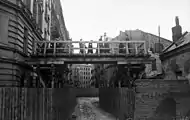 Ghetto walls lining both sides of Chłodna Street and the wooden footbridge which from January to August 1942 connected the small and big ghettos