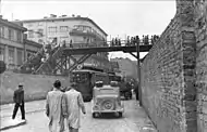 • Chłodna Street at the intersection with Żelazna Street – the marker commemorates exclusion from the ghetto in December 1941 the area west of Żelazna Street, as a result of which the Jewish district was divided into two parts called the large and the small ghettos. In order to ease heavy pedestrian traffic on Żelazna Street (the only street that connected the two ghettos) on 26 January 1942[7] a wooden footbridge was erected over Chłodna Street, becoming one of the symbols of Holocaust after the war.