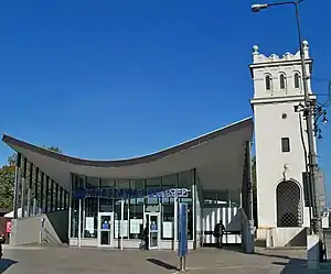 West entrance to the platforms with the ticket office, located on the level of Aleje Jerozolimskie on the edge of the terrace of the Vistula next to the Poniatowski Bridge's little tower