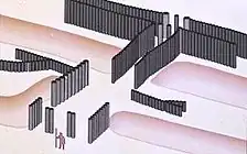 These include the tombs at Züschen near Fritzlar, at Lohra, at Naumburg-Altendorf, at Hadamar-Niederzeuzheim (now rebuilt in a park at Hachenburg), at Beselich-Niedertiefenbach, at Warburg, Rimbeck and at Grossenrode, as well as two tombs near the Calden enclosure.[13] A tomb at Muschenheim near Münzenberg may also belong to the same type,[14] as may a further one at Bad Vilbel near Frankfurt am Main which was destroyed after 1945.[15] The best known of these tombs are those of Züschen, Lohra, Niederzeuzzheim and Altendorf. They normally contained the inhumed remains of multiple individuals (the Altendorf tomb contained at least 250 people) of all ages and both sexes. Lohra is an exception insofar as there the dead were cremated. Gravegoods are scarce but include pottery (collared bottles), stone tools and animal bones, especially the jawbones of foxes, which may have played a totemic role. The Züschen tomb is also remarkable for the presence of rock art.[16] Some of the tombs can be directly associated with nearby hilltop sites or settlements,[17] that is, the Züschen tomb with the Hasenberg and the Calden tombs with the earthwork. According to the German archaeologist Waltraud Schrickel, the association with gallery graves suggests a west European influence, perhaps from the Paris Basin in France, where very similar tombs occur.[18] The Wartberg tombs appear to start developing around 3400 BC, earlier than most of the known settlements.[19]