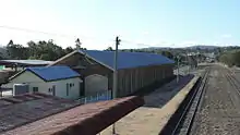 The Goods Shed is a single-storeyed sandstone building, situated to the north of the Station. A narrow linear building on a north–south axis, it measures some 70 metres (230 ft) in length by 11 metres (36 ft) in width. The gabled roof is of corrugated iron, with translucent skylight panels and a deep overhang on the western side protecting the loading bays. The stonework is of picked finish with draughted margins, laid as coursed ashlar. Added to the south of the building is a small timber office, and to the west is a recent steel canopy structure. Inside the building is a railway siding, with the remainder being a timber platform. The building is still in use as a goods shed.[1]