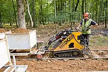 Two trains consisted of white-painted trucks each coupled together. Each 10 tonne train consisted of 10 trucks each taking 1 tonne.[12] The locomotive was the modified Boxer 532DX mini-skid upon which the driver stood, either pushing or pulling the coupled trucks. The trucks had plastic wheels designed either to ride along the cylindrical track or along a flat surface. The wheels had needle roller bearings. The Boxer obtained traction by means of its rubber track bearing upon the sleepers, but at the rear it had two wheels riding upon the track, the height of which could be adjusted hydraulically. They could also be raised to free the Boxer from the track whilst it was negotiating points.