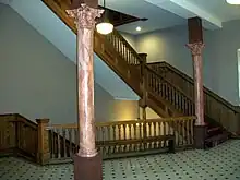 The courthouse contains three stories and a basement, a grand staircase, and hydraulic elevator. The basement (first floor) housed the offices promised to the City of Fayetteville, including the mayor. The second floor housed court clerks, the county judge, a vault, and three outdoor porches. The third floor housed a large courtroom with a slanted floor, jury rooms, judge chambers, and a porch. The fourth floor contained a balcony over the courtroom and access to the clock/bell tower. The courthouse features round-top arches over its windows, porches, and grand entrance, round towers with conical roofs, and brickwork, each characteristic of Richardsonian Romanesque architecture.[6] Inside, the building contains glazed brick fireplaces in all offices, and ceramic mosaic floor tiles in all foyers and corridors. There is a mural dedicated to those Washington County persons who died in World War I, completed in 1920 by William Steene. The building also contains the Freedom Shrine, housing replicas of many important freedom documents such as the Mayflower Compact and the Declaration of Independence.[7]