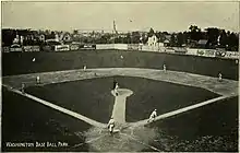 The second home of the Indianapolis Indians, from 1905 to 1931, is now referred to as the West Washington Street Park, but at the time was known as either Washington Park or Washington Baseball Grounds. The park was located at 1235 West Washington Street, just west of the White River (39°46′1″N 86°10′54″W / 39.76694°N 86.18167°W). Like its predecessor at Washington and Gray, this was a very rudimentary baseball venue with an all-wooden grandstand and a capacity of just over 4,000. In 1909 the park was completely rebuilt, and the seating capacity was enlarged to 20,000, the most in the minor leagues, due mainly to the addition of extensive bleacher sections. It also boasted the largest playing field of any minor league park, and was larger than many major league parks of the era. Aside from hosting the American Association's Indians, this venue was home to the Indianapolis ABCs of the Negro National League from 1920 to 1926.[1] The second ballpark also served as the home field for the 1911 Butler Christians football team.[2][3]