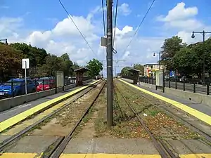 In the early 2000s, the MBTA modified key surface stops with raised platforms for accessibility. The renovation of Washington Square - part of a $32 million modification of thirteen B, C, and E branch stations - began in November 2001.[4][5][6] The renovation was completed in October 2002; delays in construction caused cascading delays to similar renovations at Boston University East and Boston University Central.[7] During construction, temporary platforms south of Washington Street were used.