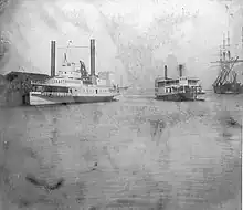 Washoe suffered a catastrophic boiler explosion six months after she was launched. She was heading upriver from San Francisco to Sacramento when the boilers blew near Steamboat Slough, about 12 miles (19 km) north of Rio Vista.[1] The explosion of 9 p.m. on September 5, 1864, resulted in 54 confirmed deaths and 67 missing passengers.[2] Other accounts have the confirmed death toll from 70 to more than 80.[3][1][4] The history of Sacramento County published in 1890 pegs the deal toll at close to 90.[5] According to the New York Times, "the engineer said before he died that the cause of the explosion was rotten iron in the boiler."[6] According to another report, Washoe was racing Chrysopolis at the time of the explosion.[7] Mark Twain was a news writer for the San Francisco Call at the time and wrote up the newspaper's mournful coverage of the tragedy.[4] Owner Captain Kidd had her salvaged and restored and she steamed again until 1878 when a catastrophic fire put her out of service for good.[8]