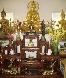 There are two buildings located on the temple complex. The first building contains living quarters for the 8 monks as well as a kitchen and the main prayer hall. The prayer hall is equipped with icons of Buddhas and Arahants. A row of pictures along the wall depicts the life of the Buddha as well as the Buddha's previous incarnations. There are also portraits of the royal family of Thailand and an American flag. A large sofa is located at the back of the prayer hall for those who cannot sit on the floor. The second building contains a large hall used for festivals, weddings, and other celebrations. During the day, this space is used by the lay community to sell fresh produce and delicacies such as Thai soup, noodles, and fried bananas. At night, the space is often rented out for private parties. All of the proceeds from these activities serve to support the monastery. The temple grounds also support gardens for produce, herbs, and flowers. Many of the monks enjoy tending the gardens as a pastime.