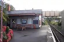 The station still has a single platform and station building, located on the opposite side of the single track running line from Watchet town centre and harbour. It is connected to them by a footbridge at the west end of the station, and a pedestrian level crossing at the east end. The former goods shed on the opposite side of the track is now occupied by the Watchet Boat Museum.[2]