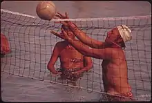Water volleyball (also called pool and acqua volleyball) is a competitive middle-court oriented water game.[1] It can be played between two teams, each team consisting of 1 to 4 players, depending on the area of water in which the game is being played.
