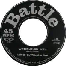 Hancock filled in for pianist Chick Corea in Mongo Santamaría's band one weekend at a nightclub in The Bronx when Corea gave notice that he was leaving. Hancock played the tune for Santamaría at friend Donald Byrd's urging. Santamaría started accompanying him on his congas, then his band joined in, and the small audience slowly got up from their tables and started dancing, laughing and having a great time. Santamaría later asked Hancock if he could record the tune. On December 17, 1962, Mongo Santamaría recorded a three-minute version, suitable for radio, where he joined timbalero Francisco "Kako" Baster in a cha-cha beat, while drummer Ray Lucas performed a backbeat.[7] With the enthusiasm of record producer Orrin Keepnews, the band re-recorded the song and released it as a single under Battle Records.[8][9] The single reached number 10 on Billboard in 1963.[10] Santamaría included the track on his album Watermelon Man! (1963). Santamaría's recording is sometimes considered the beginning of Latin boogaloo, a fusion of Afro-Cuban rhythms with those of R&B.[11]