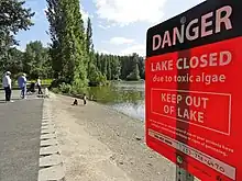 Algae in Waughop Lake has affected the lake for a long time. The algae are fed by nitrogen, supplied by the duck droppings and sediment, which the lake has plenty of. There are serious algae blooms, and it is not advisable to come into contact with the water. During algae blooms, the lake may be closed or restricted to visitors. For some of the year, fishing is restricted due to the algae problem. The bulk of the algae is green cyanobacteria, a phylum or waterborne photosynthesizing prokaryotes.