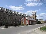 A 90-acre (360,000 m2) portion of the original village area is listed as a historic district, the Wauregan Historic District, encompassing structures that are directly related to the economic and social activities of the mill. The district was listed on the National Register of Historic Places in 1979.[1] Extant buildings in the Wauregan historic district include the Wauregan Mill, an H-shaped building built from local fieldstone; James Atwood's home; the two boarding houses; the company store; and over one hundred workers' houses.[3] Architectural styles represented include Greek Revival and Late Victorian architecture.[4]