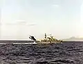 View of HMS Exeter from HMS Cardiff approaching Ascension Island, returning from the Falklands. Two Westland Lynx and a Westland Wasp are visible.