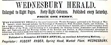 The Wednesbury Herald was a weekly newspaper published in the Municipal Borough of Wednesbury, England, during the Victorian era. It billed itself as the only conservative paper published there. The publisher was Robert Ryder and an associated Ryder's Annual was published each November.[1][2] Microfilm copies of the paper are held by Sandwell Metropolitan Borough Council archives.[3]