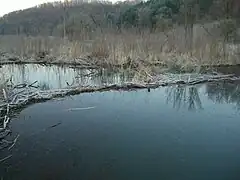 In spite of the benefits of beaver to trout and bird abundance and diversity, the Wisconsin Department of Natural Resources continues to recommend removal of trees and brush from the banks of several Kickapoo river watershed streams to reduce beaver colonization.[6] The town of Clinton is holding hearings to decide the fate of the Weister Creek beavers.[13] At the first hearing, May 12, 70 citizens showed up and it was standing room only in a debate between those who wanted to protect the beavers versus those who feared further road damage or loss of pastureland to wetland.[14][15] At a special follow-up town board meeting on June 1 a compromise was reached to adopt a proposal by Steve Solberg, an environmental engineer of La Crosse and Ben Hansen of Viroqua, for a flow device to permanently lower the beaver pond by 1.5 feet (0.46 m) so that it would not threaten Dell Road and to open up pastureland that had been flooded by the beavers. The lowered pond level should encourage the beaver to relocate downstream. It is hoped that funding will be provided by the Ho Chunk Nation.[16][17]