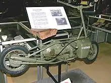 The Welbike was a British single-seat folding motorcycle produced during World War II at the direction of Station IX — the "Inter Services Research Bureau" — based at Welwyn, UK, for use by Special Operations Executive (SOE). It has the distinction of being the smallest motorcycle ever used by the British Armed Forces.[1] Between 1942 and 1943, 3,641 units (plus a prototype and some pilot models) were built and, although not much used by the SOE, some were issued to the British 1st and 6th Airborne Divisions and some were used at Arnhem during Operation Market Garden.[2]