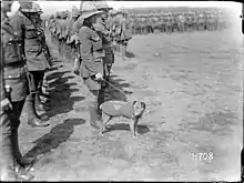 The Wellington Regiment adopted an Irish Terrier, known as Scout Sergeant Major Paddy, as the regimental mascot. Paddy was originally adopted as the mascot of the 7th (Wellington West Coast) Regiment prior to the First World War. He joined the Wellington Battalion as a Private at the beginning of the war. Initially Lt. Col. Malone would not allow Paddy to travel with the battalion to Egypt. After an appeal to the brigade major, however, permission was granted and Paddy sailed for Egypt with the Battalion on 16 October 1914.