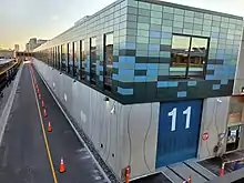 However, the planned developments were only partially built, and none of the planned interchange improvements came to fruition. The first new construction was several office buildings in the northeast parcel in the early 1990s, followed by the Wellington Garage west of the rail yard in 1997. The MBTA agreed to lease 950 spaces of the 1350-space, 9-level garage for 15 years, after which the MBTA took ownership of 600 of the spaces and the remainder reverted to the developer.[24] The Station Landing complex, envisioned as new urbanist transit-oriented development, was constructed over much of that time period, finishing around 2012. The project included 600 condominiums in a 12-story complex, 125,000 square feet (11,600 m2) of retail space (with the possibility of over 1 million square feet at full build), and an expansion of the garage to 1900 spaces.[25][26]