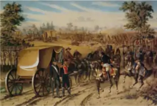 On March 17, 1811, Generals Allende, Jiménez, and Aldama, Padre Hidalgo, and more than 1,000 soldiers of the rebel army departed Saltillo to march north to Monclova. The caravan was strung out on the road over a distance of 24 kilometres (15 mi). An advance guard led the convoy, followed by more than 20 horse-drawn carriages transporting the rebel leaders. Following the carriages was a mule train with loads of supplies and silver bullion. Next came caissons of artillery, cumbersome ox-drawn carts carrying munitions, and, finally, the bulk of the soldiers and a rearguard. On the evening of March 20, the rebels camped 16 kilometres (9.9 mi) from the Wells of Baján.[8][9]