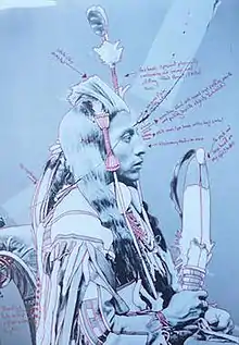 In 1880, six Crow chiefs traveled to Washington, D.C. to talk with the president because the settlers were about to build a railroad through their hunting territory.[5] She researched Medicine Crow/Peelatchiwaaxpáash (Raven) for her exhibit of the Crow Peace Delegation to Washington in 1880 and discovered the narratives behind elements of the iconic picture. She used a red pen on a print of this famous image to notate his outfit and the symbolism attached to elements such as his ermine shawl, the bows in his hair, and the eagle fan he is holding.[5] Red Star said she wanted to use the details of his clothing, and the ledger drawings he made upon his return to the reservation, to humanize Medicine Crow.[5] What she learns in research emerges in her creative process, which she articulates with visual means.[5]