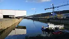 In addition, the Werner-Schaus government continued its efforts to modernise and enlarge the country's economic infrastructure.[5] The law of 22 July 1963 created the port of Mertert.[5] The canalisation of the Moselle was finished by 1964.[5] On 26 May 1964, the first official trip was taken on the new waterway which gave Luxembourgish steel access to maritime ports, in the presence of French President Charles de Gaulle and West German President Heinrich Lübke.[5] On 17 April 1964, the hydro-electric plant at Vianden was opened.[5]