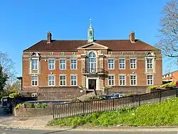 The works began with the demolition of Kingston House which took place in 1933.[7] The new building was designed by C. H. Rose and H. R. Gardner in the neoclassical style and built in red brick with stone dressings.[1] At its official opening in May 1935, Viscount Wakefield unveiled a plaque to commemorate John Wesley's historic visit to Kingston House.[8] The design involved a symmetrical main frontage with nine bays facing onto the corner of Bull Hill and Leret Way with the end bays featuring sash windows with swan-necked pediments on the first floor; the central bay featured a flight of steps leading up to a doorway with a stone surround and brackets supporting an entablature.[1] On the first floor there was an iron balcony bearing the town's coat of arms and a prominent rounded headed French door flanked by full-height pilasters supporting a pediment.[1] At roof level there was a copper flèche and a weather vane.[1] Internally, the principal rooms were an entrance hall, which was decorated in an Art Deco style, and a semi-circular council chamber which jutted out to the rear of the building and featured fine wooden panelling.[1]