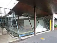 Completed in early 1953, West's Furniture Showroom was "designed with the utmost economy in the contemporary manner".[53] The showroom comprised a rectangular 64-by-34-foot (20 by 10 m) space with a cantilevered, upswept awning that extended over the Wickham Street footpath. The building was predominantly of masonry construction, with a glass shopfront, a concrete floor, and a shallow-pitched, asbestos- and bitumen-lined roof constructed from timber trusses. The roof-top was used as garden area for displaying outdoor furniture and some furniture assembly operations.[54][55][56][57] The existing timber residence was relocated to the rear of the site and converted for use as a workshop for the assemblage and storage of furniture. The workshop enabled access to the roof-top display area, and was level with Knapp Street for the loading of goods to transport vehicles. Its ground floor consisted of a woodwork shop, and the upper floor was designated for polishing and inventory storage.[58][59][60][61] Public access to the showroom was through a single timber door at the northeast end of the Wickham Street shopfront, adjacent to a random rubble stone wall. Projecting from the angled shopfront, the door frame was supported by glass, so that it appeared to float.[1][62]