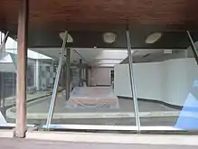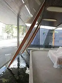 In 2008, architect Robert Riddel purchased the building and carried out extensive renovations and conservation work.[114] This was completed with the guidance of Laurence West himself, contemporary documentation, and the evidence provided by original fabric remaining within the building. Marks in the front stone wall and the ceiling lining enabled Riddel to reconstruct the front window at the original angle. A new front door was also installed, replicating the original design. The side pedestrian arcade was re-established with new glass walls, and a new wide glass door and metal ramp were added to the end of the arcade to provide a secondary entrance and equal access. Concrete that had filled the serpentine pond was removed, revealing some early edging and concrete pads. The pond was waterproofed, with the edging reconstructed, and it was once again filled with water. Light-wells were uncovered and re-glazed, with the original arched framing re-sheeted. Paint was removed from the hardwood timber posts and front awning's soffit cladding, and the showroom ceiling was sheeted with new plasterboard.[126][129][130] The shed at the rear of the site was gutted, re-lined and its roof was raised; and a new carport was added facing Knapp Street.[1][131]