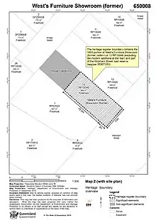 The former West's Furniture Showroom occupies part of a 344-square-metre (3,700 sq ft) urban block on the northeast edge of Fortitude Valley, Brisbane. Addressing the major thoroughfare of Wickham Street to the southeast, the building is bounded to the northwest by Knapp Street, and to the northeast and southwest by commercial properties of a similar scale. The terraced block is divided into three distinct sections, with the showroom occupying the southeast end. Buildings to the rear of the showroom are outside of the heritage boundary and are not of cultural heritage significance. A cantilevered awning projects from the showroom, over the Wickham Street footpath.[1]