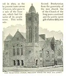The small congregation moved north in uptown Manhattan a number of times. Upon moving to the Upper West Side, one wealthy new pastor (from 1879), Anson Phelps Atterbury (1855–1931), proposed a grand church in the hopes that the congregation would expand with the expected increases to the neighborhood that the new IRT lines along Broadway would bring.[3] That pastor commissioned Leopold Eidlitz to build a diminutive midblock brick Romanesque Revival chapel in 1884, a style Eidlitz described as "muscular" Romanesque and considered appropriate to an evangelical Protestant church.[4][5][6] After a further $100,000 was raised, the main sanctuary was built in 1889–90 on the abutting corner site, to designs by Henry Franklin Kilburn in intricately carved brown and red sandstone in a stylistic continuation of Eidlitz's Romanesque chapel but re-cladding that brick chapel in sandstone and adding an offset diminutive tower.[1] The corner features a giant ribbed bell-domed belltower, which dominates the neighborhood and if not for the competing heights of apartment towers "would be one of the West Side's loveliest landmarks," according to the AIA Guide to NYC.[7]