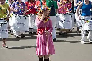 A girl holds up a banner leading the SheBoom percussion ensemble during the West-End Festival opening parade in June 2008.