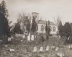 ![]() West Farms Presbyterian Church, looking uphill from the graveyard. Circa 1885. | |