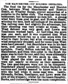 West Manchester then beat Hurst 2–0 in the semi,[12] the result considered "a bit of a fluke",[13] before coming from behind to beat Newton Heath 2–1 in the final with goals from Tomlinson and Bolton, in what was both considered a surprise and against the run of play.[14]