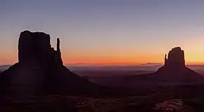 The West and East Mitten Buttes (also known as the Mittens) are two buttes in the Monument Valley Navajo Tribal Park in northeast Navajo County, Arizona. When viewed from the south, the buttes appear to be two giant mittens with their thumbs facing inwards.