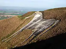 Westbury or Bratton White Horse is a hill figure on the escarpment of Salisbury Plain, approximately 1.5 mi (2.4 km) east of Westbury in Wiltshire, England. Located on the edge of Bratton Downs and lying just below an Iron Age hill fort, it is the oldest of several white horses carved in Wiltshire.[1] It was restored in 1778, an action which may have obliterated another horse that had occupied the same slope. A contemporary engraving from around 1772 appears to show a horse facing in the opposite direction that was rather smaller than the present figure. There is, however, no documentation or other evidence for the existence of a chalk horse at Westbury before 1772.