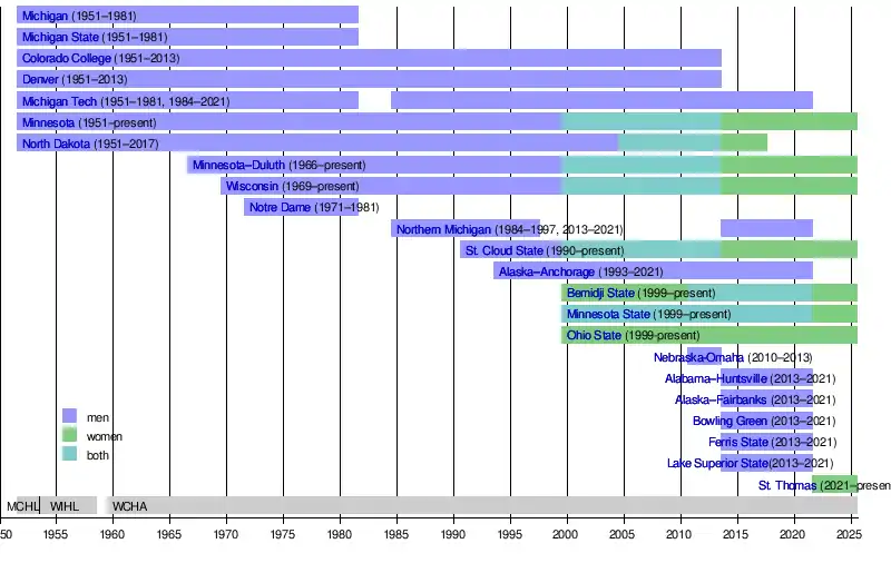 From 1951 to 1999, it operated as a men-only league, adding women's competition in the 1999–2000 season. It operated men's and women's leagues through the 2020–21 season; during this period, the men's WCHA expanded to include teams far removed from its traditional Midwestern base, with members in Alabama, Alaska, and Colorado at different times.[2] The men's side of the league officially disbanded after seven members left to form the revived Central Collegiate Hockey Association (CCHA); the WCHA remains in operation as a women-only league.[3]