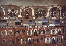 The Western Thousand Buddha Caves (Chinese: 西; pinyin: Xī Qiānfó Dòng) is a Buddhist cave temple site in Dunhuang, Gansu Province, China. The site is located approximately 35 km southwest of the urban centre and about the same distance from the Yangguan Pass; the area served as a staging post for travellers on the Silk Road.[3] It is the western counterpart of the Mogao Caves, also known as the "Caves of the Thousand Buddhas" after the founding monk Yuezun's vision in 366 of "golden radiance in the form of a thousand Buddhas".[4] The caves were excavated from the cliff that runs along the north bank of the Dang River. A number have been lost to floods and collapse; some forty are still extant. Twenty-two decorated caves house 34 polychrome statues and 800 m2 of wall paintings, dating from the Northern Wei to the late-Yuan and early-Ming Dynasties (sixth to fourteenth centuries).[3] The site was included within the 1961 designation of the Mogao Caves as a Major National Historical and Cultural Site.[5]