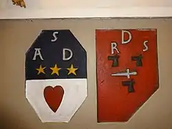 Internally at against the right (i.e.north) wall there is an original large fireplace, 5 ft. 10 in. wide. This includes a large lintel (2 ft. high) with two recessed panels. The left panel, which is octagonal, contains the initials S A D for Sir Archibald Douglas and below them the charges of his shield, namely a heart, with three mullets in chief. The right panel is oblong, containing the initials D R S for Dame Rachael Skene and below these letters a 'skean' or dagger between three wolves' heads couped.