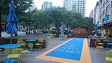 The current park and mall were proposed by the Central Association (now Downtown Seattle Association) in 1968; they took 20 years to come to fruition. Multiple lawsuits were filed throughout this time and continued after the park's opening in October 1988.[9][10] The project was marred by a design flaw, the so-called "Nightmare on Pine Street",[11] that resulted in cracked granite pavers along Pine Street and into the intersection with Fourth Avenue. The city sued the designer and won an out-of-court settlement of $515,000, enough to cover the $472,000 repair and nearly equal to the cost of the original installation.[12] Repairs began in June 1989.[13][14]